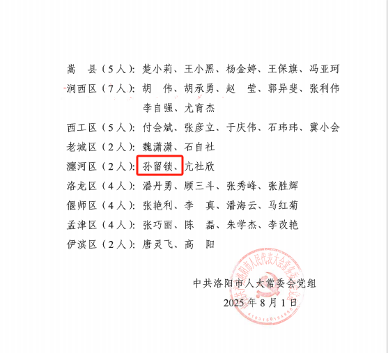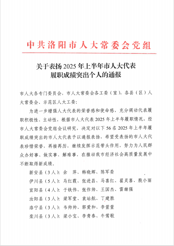 近日,中共洛陽市人大常委會黨組下發(fā)通報,對 2025 年上半年在市人大代表履職工作中表現(xiàn)突出的個人予以表彰,我公司總經(jīng)理孫留鎖榮耀上榜。這份沉甸甸的榮譽,既是對孫留鎖個人履職成效的高度肯定,更為公司增添了光彩,成為全體員工的驕傲。