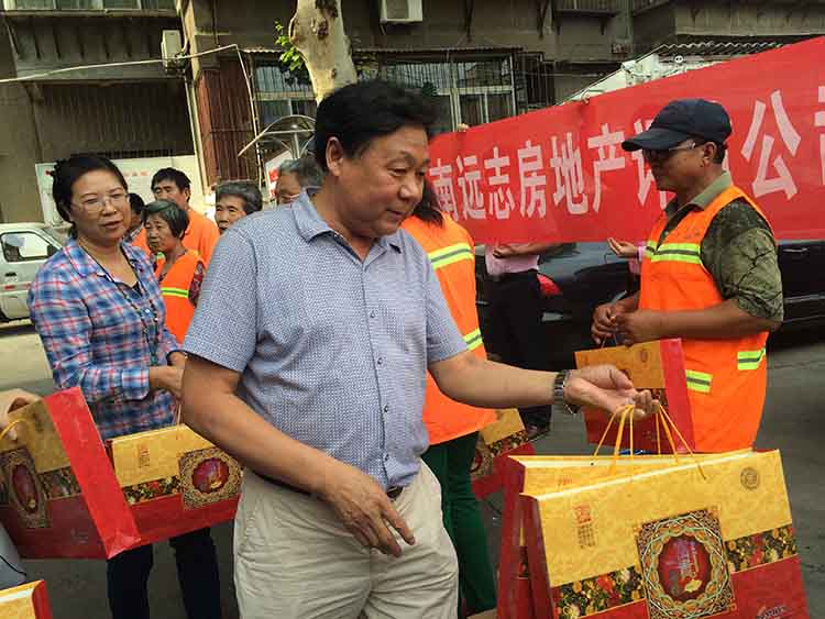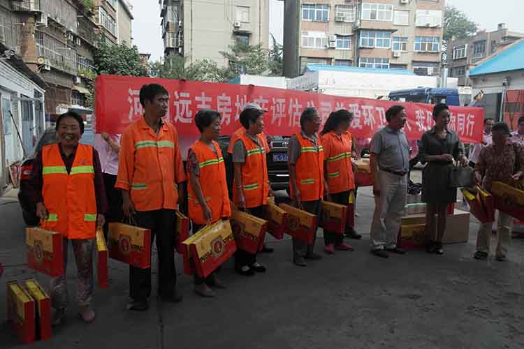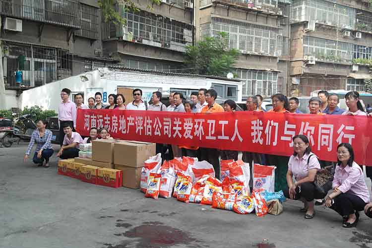 為做好環(huán)衛(wèi)工人的關(guān)愛工作,河南遠(yuǎn)志房地產(chǎn)評(píng)估有限公司特別舉辦了這次針對(duì)西工區(qū)環(huán)衛(wèi)工人的慰問活動(dòng),將月餅、洗衣粉及毛巾等節(jié)日慰問品送到了西工區(qū)環(huán)衛(wèi)工人家園一線環(huán)衛(wèi)工人代表手里?;顒?dòng)開始,環(huán)衛(wèi)局書記代表環(huán)衛(wèi)工人們向遠(yuǎn)志房地產(chǎn)評(píng)估有限公司領(lǐng)導(dǎo)的關(guān)愛表示感謝,并表示將以更飽滿的精神做好本職工作,以感謝大家的關(guān)心與愛護(hù),為廣大群眾創(chuàng)造一個(gè)更美好的洛陽(yáng)城。隨之遠(yuǎn)志房地產(chǎn)評(píng)估有限公司孫總發(fā)表講話稱:環(huán)衛(wèi)工人是城市的美容師,他們披星戴月、夜以繼日,用他們辛勤的汗水為洛陽(yáng)城創(chuàng)造了干凈和整潔的環(huán)境,對(duì)勞動(dòng)者表達(dá)了充分的敬意!至此慰問活動(dòng)***結(jié)束。